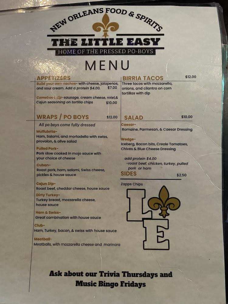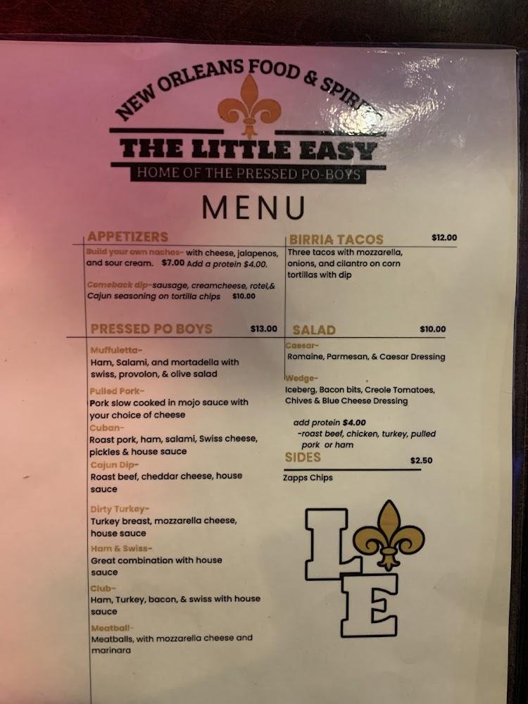 The Little Easy specializes in traditional southern comfort food. The menu features a delightful mix of dishes. Pressed po-boys take center stage, with choices like Cuban, ham & Swiss, and meatball. Tacos and salads also grace the menu, appealing to a variety of tastes.